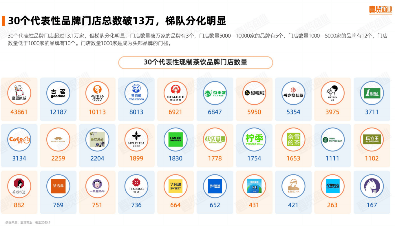 《报告》显示,截至2025年9月,全国30个代表性现制茶饮品牌门店总量已突破13.1万家,行业分化趋势愈发明显。头部品牌“巨无霸”效应显著,蜜雪冰城以4.38万家门店稳居首位,规模接近第二名古茗(1.2万家)的四倍。