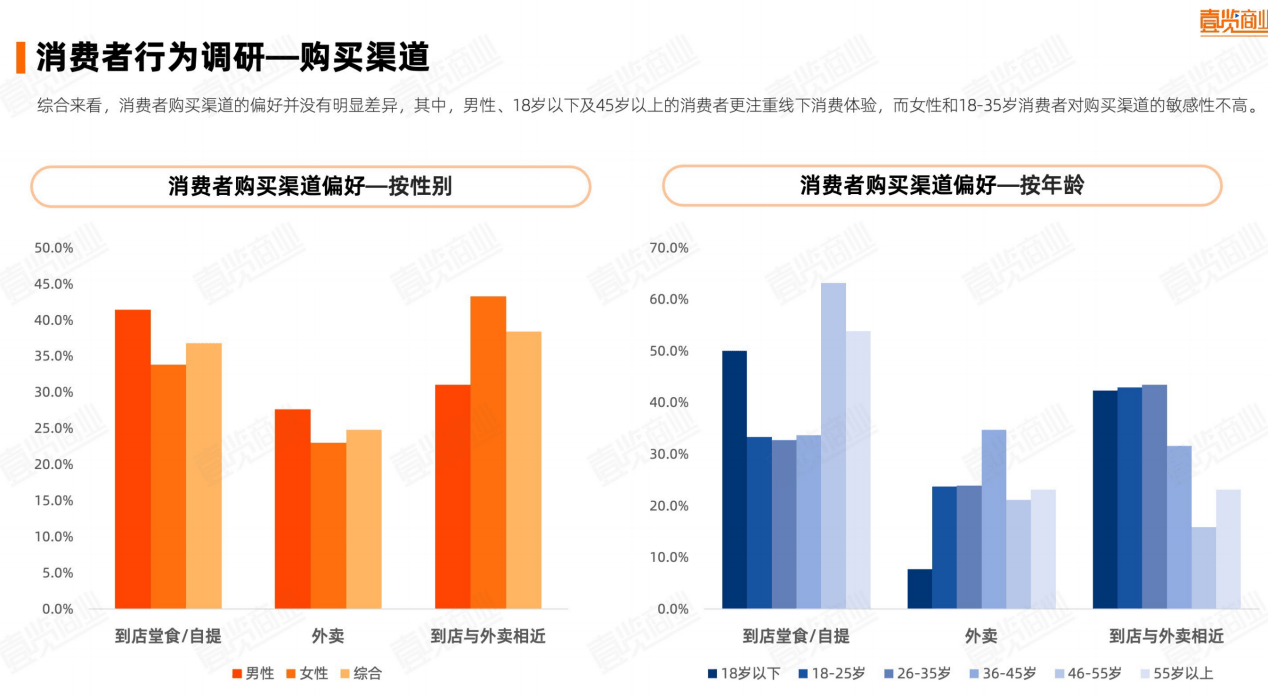 在消费场景上,线下体验仍是主战场。数据显示,无论性别或年龄差异,到店自提与堂食依旧是最主流的购买方式,其中男性与18岁以下、45岁以上人群对线下场景依赖更高;而18—35岁的年轻女性则表现出更强的渠道包容性,线上点单、线下自提已成为她们的日常习惯。